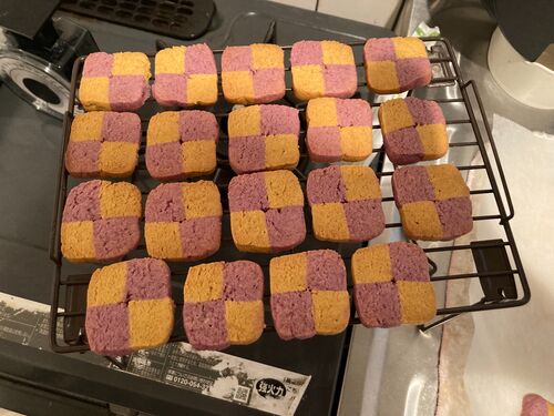 作ってみました ので、主に来年の自分用にレシピメモを残しておきます。 【材料】 ・ケーキ用マーガリン:50g ・砂糖:大4 ・卵:全卵の半分 ・小麦粉:大4.5 ×2 ・紫芋パウダー:大1/2 ・かぼちゃパウダー:大1/2 マーガリンを常温に戻しておくよ! 棒状で…