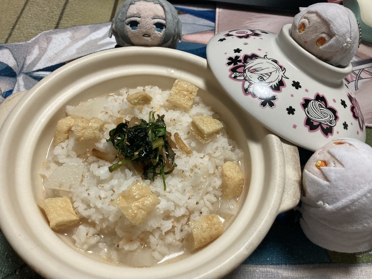 七草もすずなとすずしろ以外はえぐみがなるべく出ないよう、すずなの皮と一緒にごま油で炒めて後からオンしたり……少しは手をかけてみました。